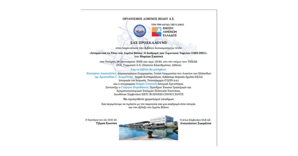Ο Οργανισμός Λιμένος Βόλου μετά τη θερμή ανταπόκριση του κοινού στην παρουσίαση του βιβλίου-λευκώματος με τίτλο «Ιστορώντας τη Ρότα του Λιμένα Βόλου: Η διαδρομή του Λιμενικού Ταμείου (1883–2001)» της Μαρίας Σπανού στον Βόλο και σεβόμενος την επιθυμία των αναγνωστών έχει τη χαρά να σας προσκαλέσει στην παρουσίαση του βιβλίου την Τετάρτη 28 Ιανουαρίου 2026 και […]