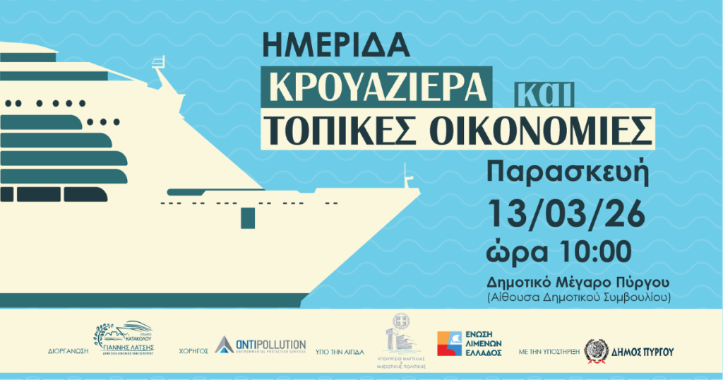 Με στόχο την ανάδειξη της κρουαζιέρας ως σημαντικού μοχλού οικονομικής και κοινωνικής ανάπτυξης, το Δημοτικό Λιμενικό Ταμείο Πύργου με την υποστήριξη του Δήμου Πύργου και υπό την αιγίδα του Υπουργείου Ναυτιλίας και Νησιωτικής Πολιτικής και της Ένωσης Λιμένων Ελλάδας, διοργανώνει την Παρασκευή 13 Μαρτίου 2026 στις 10 π.μ. ημερίδα με θέμα «Κρουαζιέρα και Τοπικές Οικονομίες», στην Αίθουσα […]